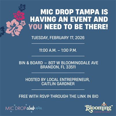 Mic Drop Tampa, a local women-led speaker series that spotlights professionals, creatives and community voices, will host its next session Tuesday, February 17, 2026, from 11:00 a.m. – 1:00 p.m. at Bin & Board, 807 W Bloomingdale Ave, Brandon, FL 33511.