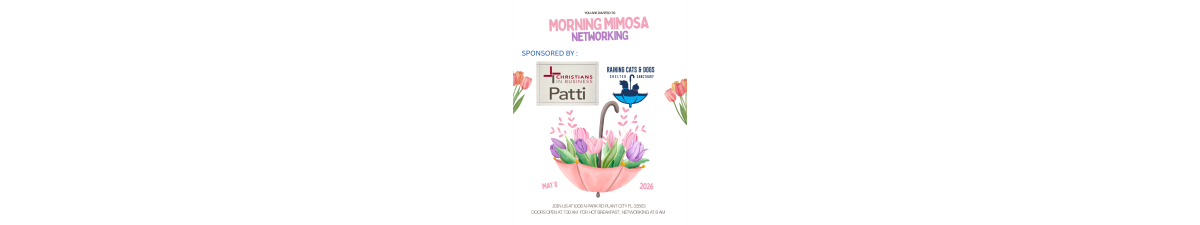A free networking event for small businesses and nonprofits. Join us for an hour of networking and a presentation. This month the sponsors and presentations will be by the Valrico Fishhawk Chamber of Commerce's very own members, Patti Sutherland with Christians in Business and Karyn Scech presenting Raining Cats and Dogs! Please support them at this great networking opportunity!